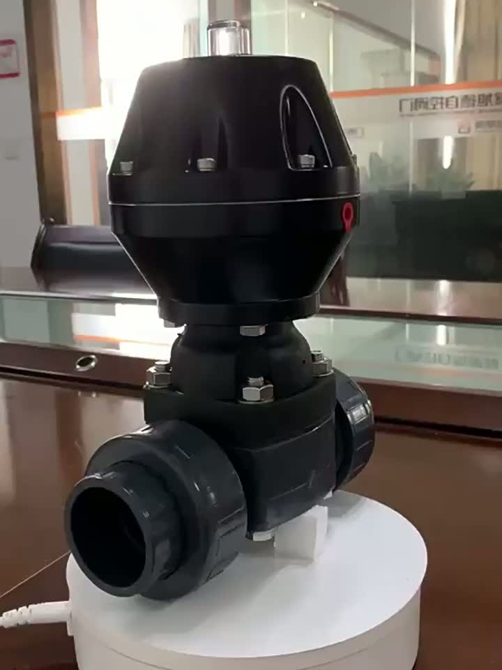Пневматический двойной диафрагмный клапан UPVC оснащен компактным и простым дизайном. Корпус клапана, изготовленный из пластика UPVC, имеет сероватый - синий оттенок, придающий ему легкий и ненавязчивый вид. На вершине тела установлен черный пневматический привод, который выделяется своими гладкими контурами и небольшим красным индикатором, что позволяет легко идентифицировать статус эксплуатации с первого взгляда. Двойная структура объединения по обе стороны от корпуса клапана указывает на его простоту установки и разборки.